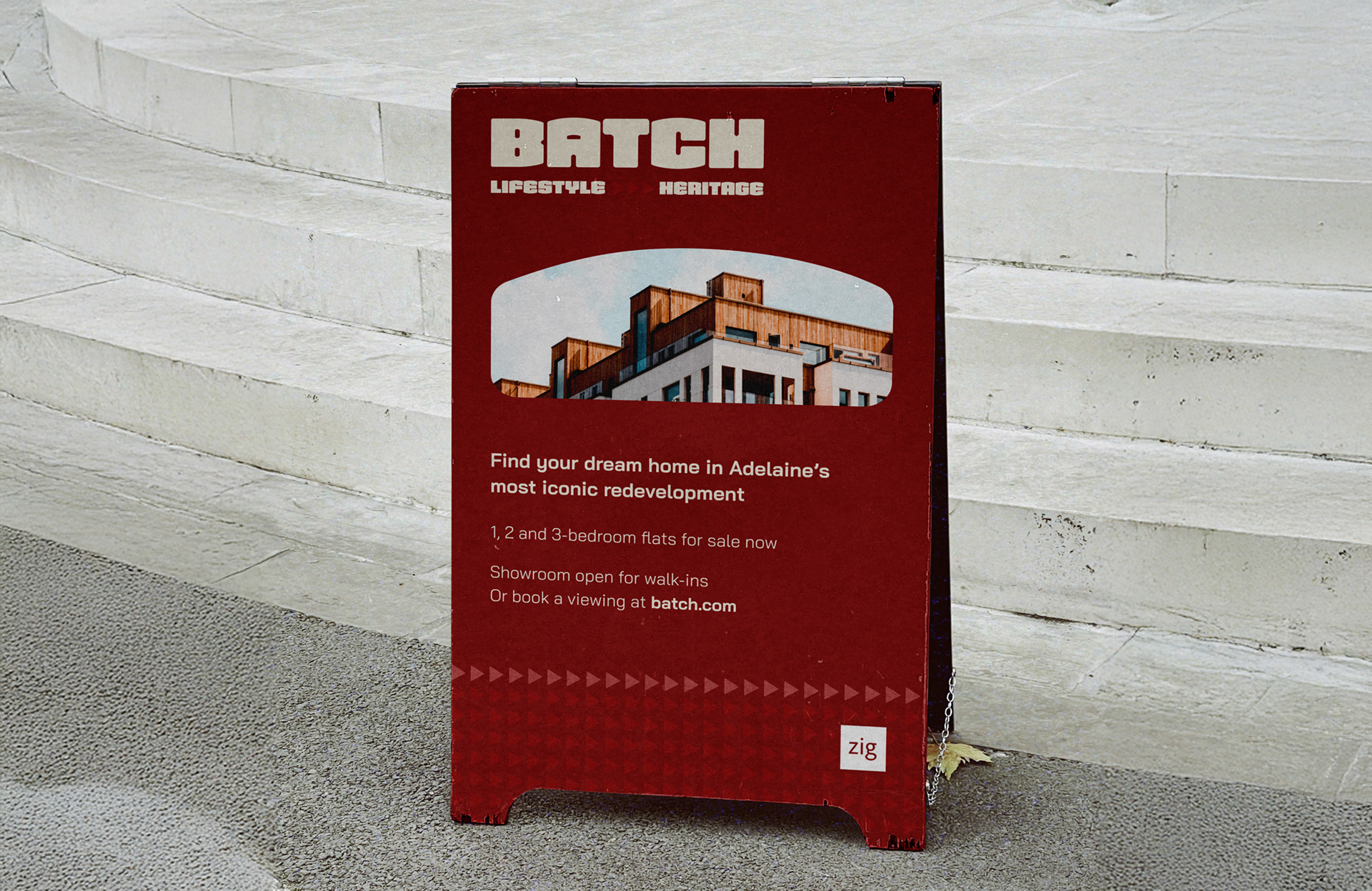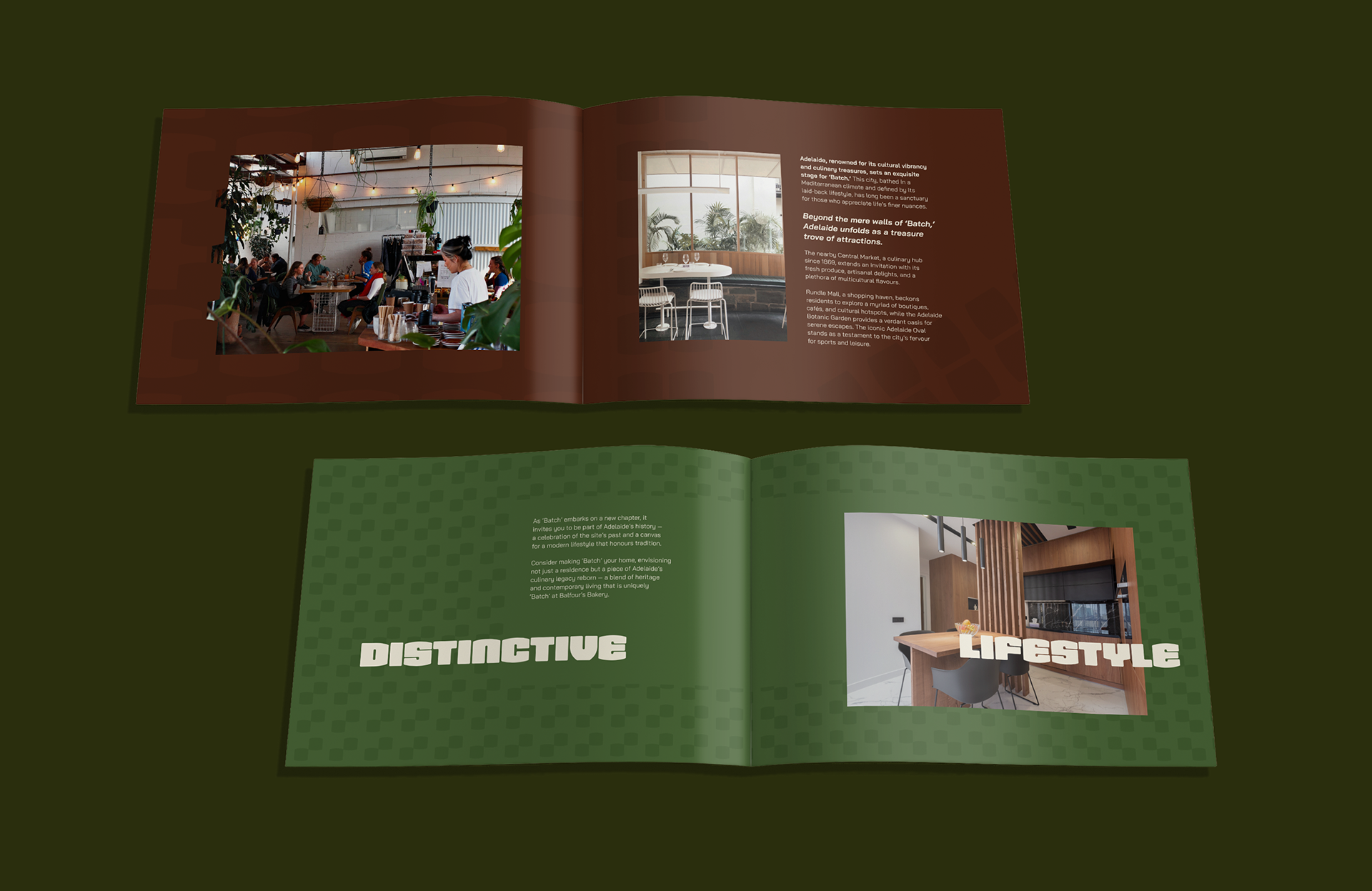 Building on the history of the site as a bakery, the concept is inspired by what one might find in one; an oven and a batch of baked goods. The idea of a batch is visually translated into various patterns, which breaks away from typical property brochure designs.