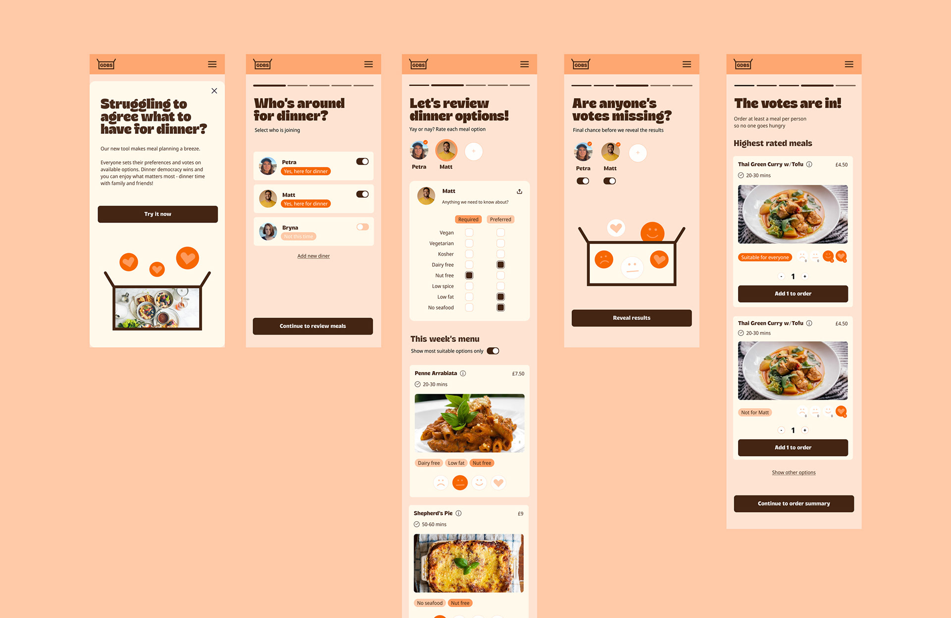 Shared households often struggle to find meals that satisfy everyone’s unique food preferences, while keeping the meal process fair and collaborative. This makes the selection process lengthier and leads to disagreements. The goal is to design a feature within an existing app that takes away the friction from meal selection.